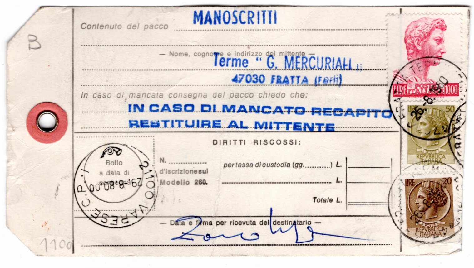 ![]() | ![]() | Pacco ordinario, inviato in data 1981-06-25. Periodo tariffario in vigore dal 01/01/1981 al 30/09/1981, secondo porto, da 1 a 3 Kg. Composizione tariffa: integrazione bollettino L. 50, tariffa pacco ordinario L. 600, per un TOTALE di L. 650. NOTE: tariffa ridotta per editori, sconto 50% su tariffa pacco ordinario. - Dettagli tariffa |